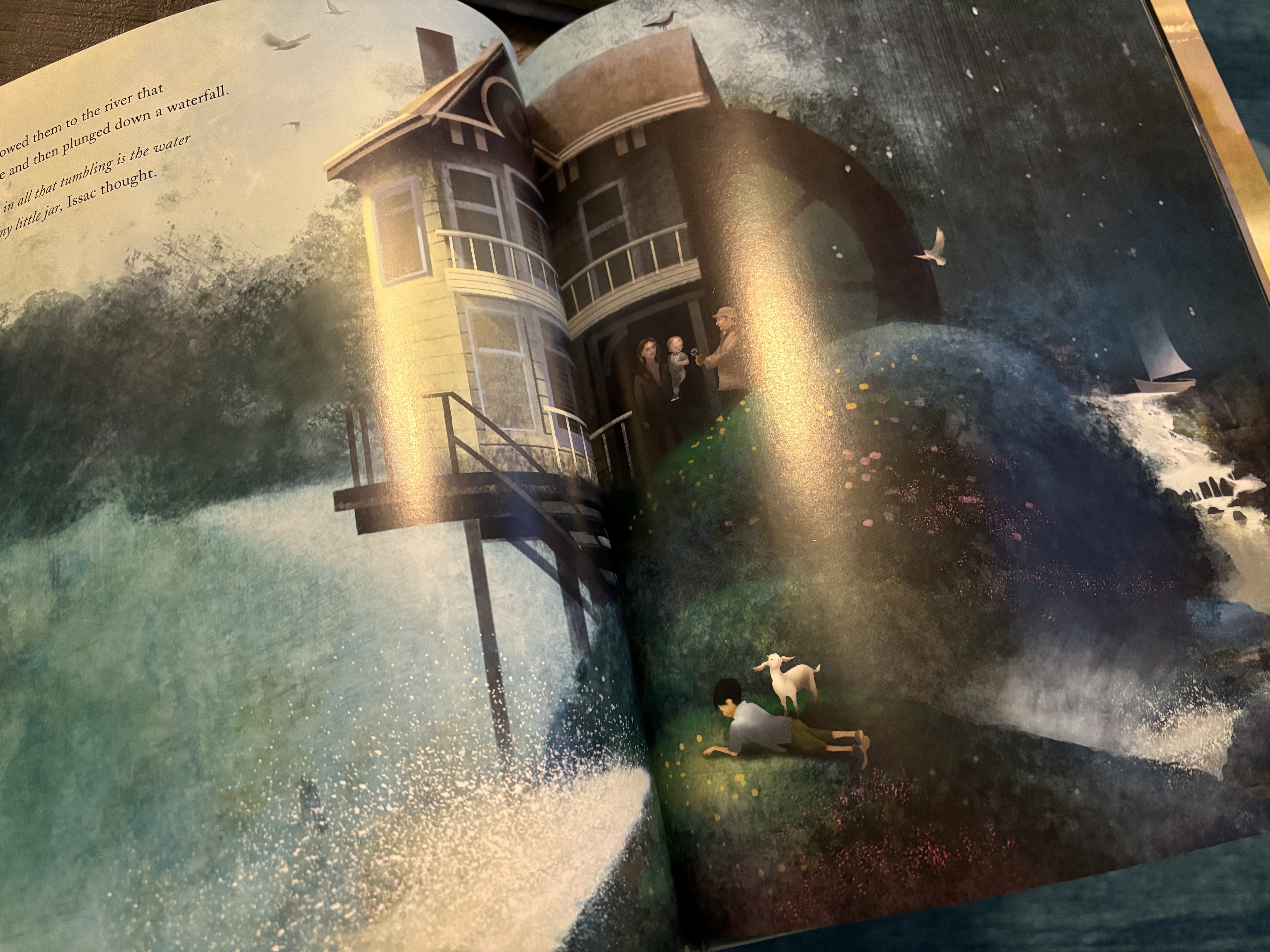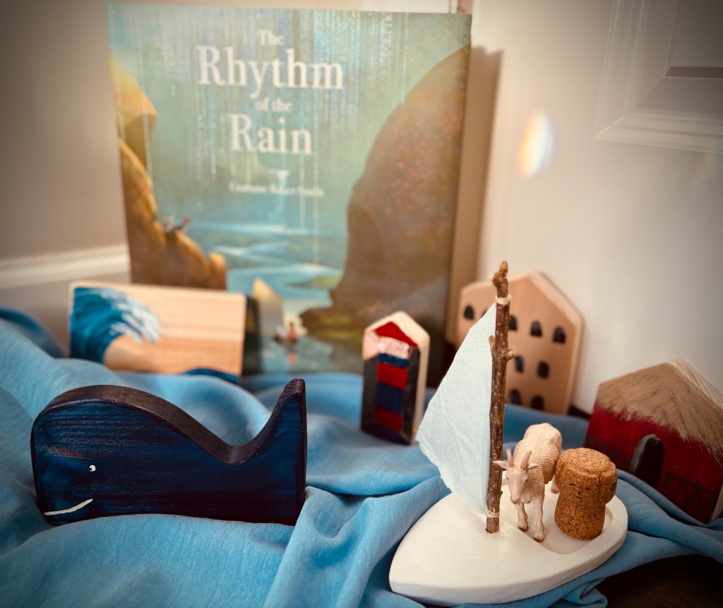 It follows the journey of a tiny jar of water across the world, through the ocean, past villages and cities, through rain drops and waterfalls, and finally back to the small pool where a little boy plays. To add to this enchanting book and to encourage retelling, I’ve collected and painted a few simple props that make an appearance in the story.